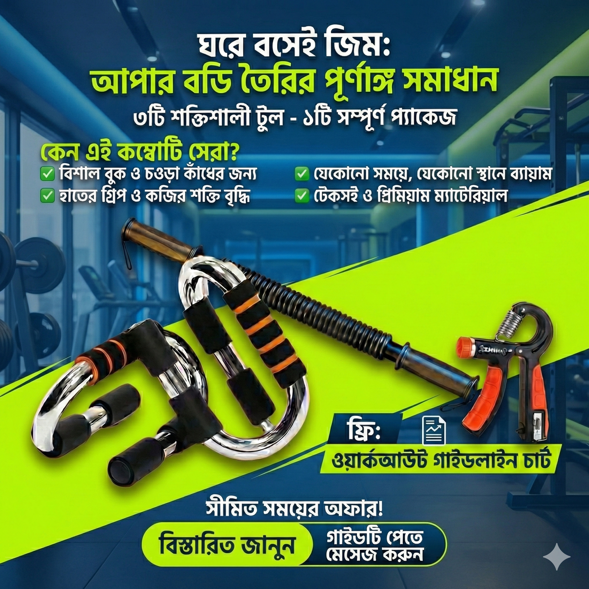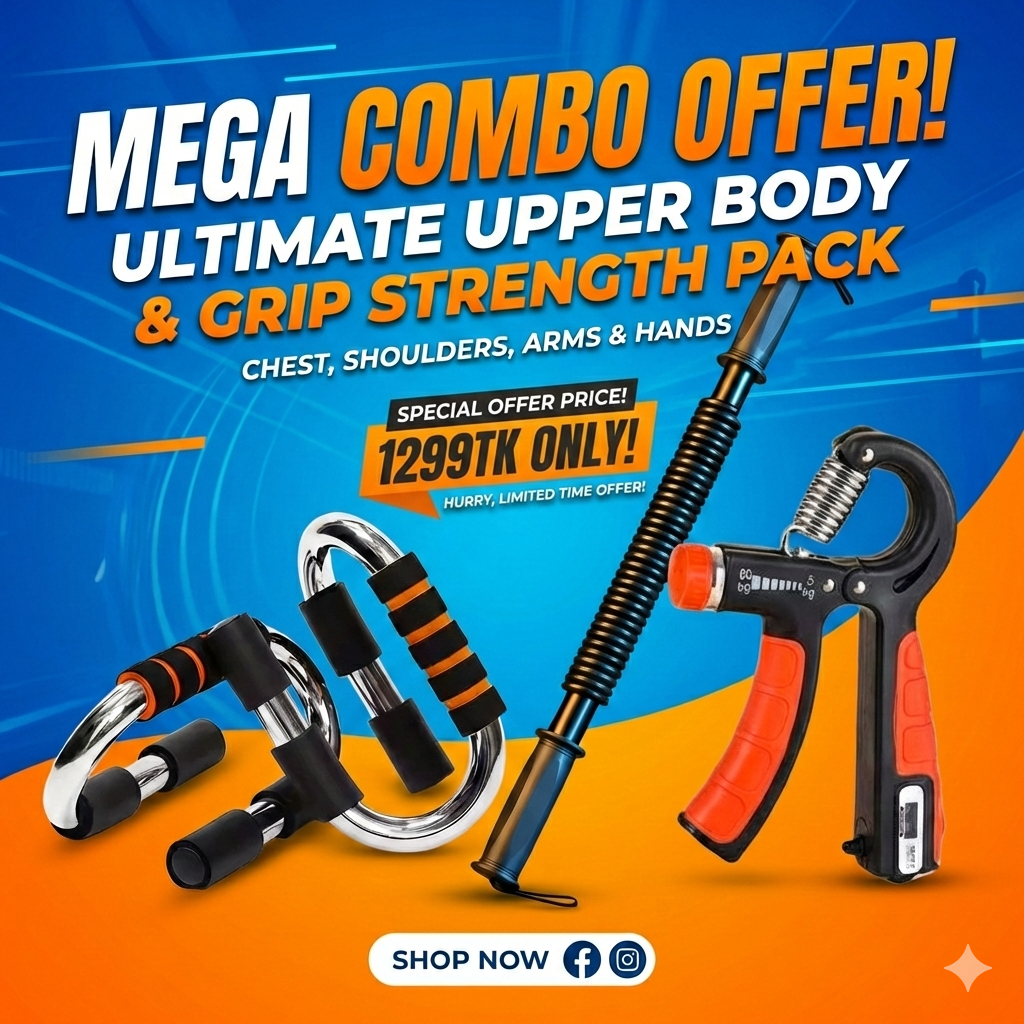 ব্যস্ত জীবনের কারণে জিমে যাওয়ার সময় বা সুযোগ হয়ে ওঠে না? চিন্তার কিছু নেই! আমাদের ‘সেরা আপার বডি ও মাসেল বিল্ডার সেট’ দিয়ে আপনার ঘরকেই বানিয়ে ফেলুন পার্সোনাল জিম। এই প্রিমিয়াম ৩-ইন-১ কম্বো প্যাকেজটি বৈজ্ঞানিকভাবে ডিজাইন করা হয়েছে আপনার শরীরের উপরের অংশের প্রতিটি প্রধান পেশীকে টার্গেট করে শক্তিশালী করার জন্য।